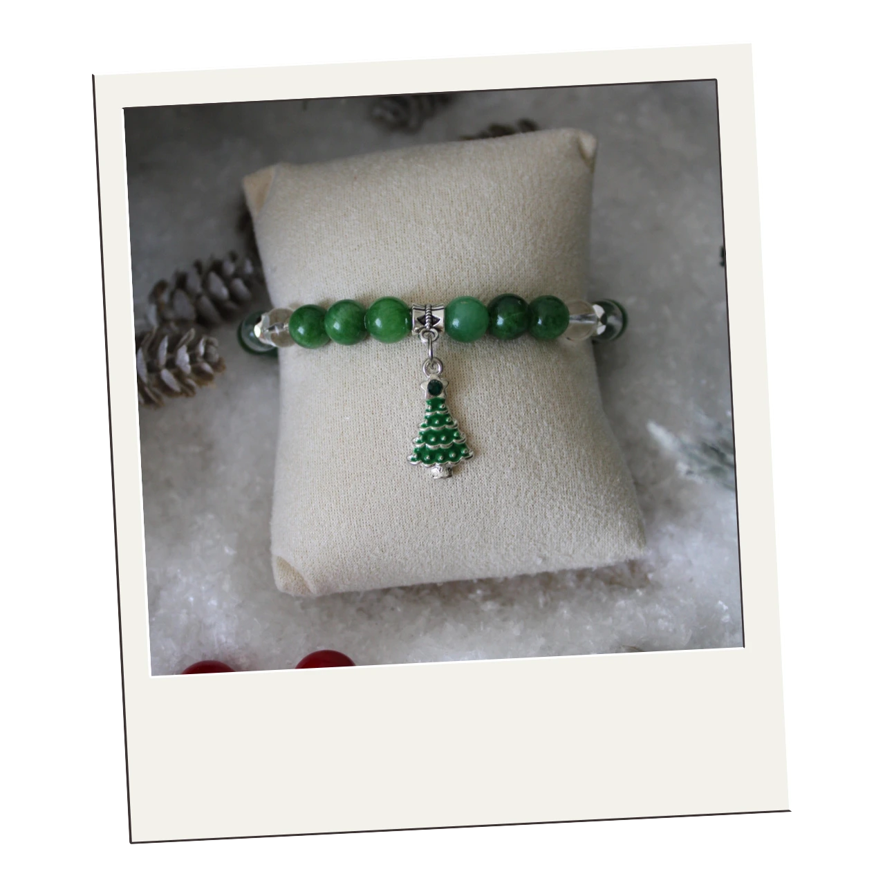 Zöld jade-hegyikristály zöld karácsonyfa medálos ásvány karkötő – az ünnepi természet harmóniája