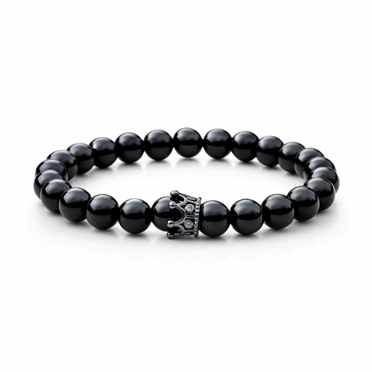 A Black king ásvány karkötő egy stílusos és impozáns ékszer, amely a fekete ónix eleganciáját és a fekete korona hatalmát kombinálja.