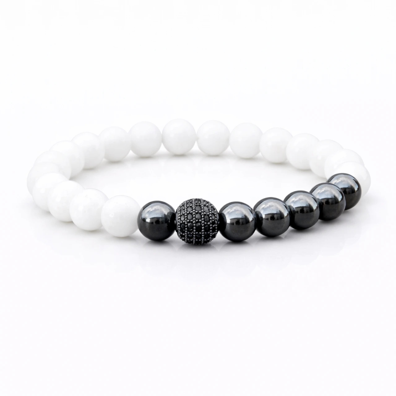 - Jade: fehér színű jade gyöngyök, amelyek szelíd, nyugtató hatással bírnak és fokozzák a karkötő esztétikai értékét.