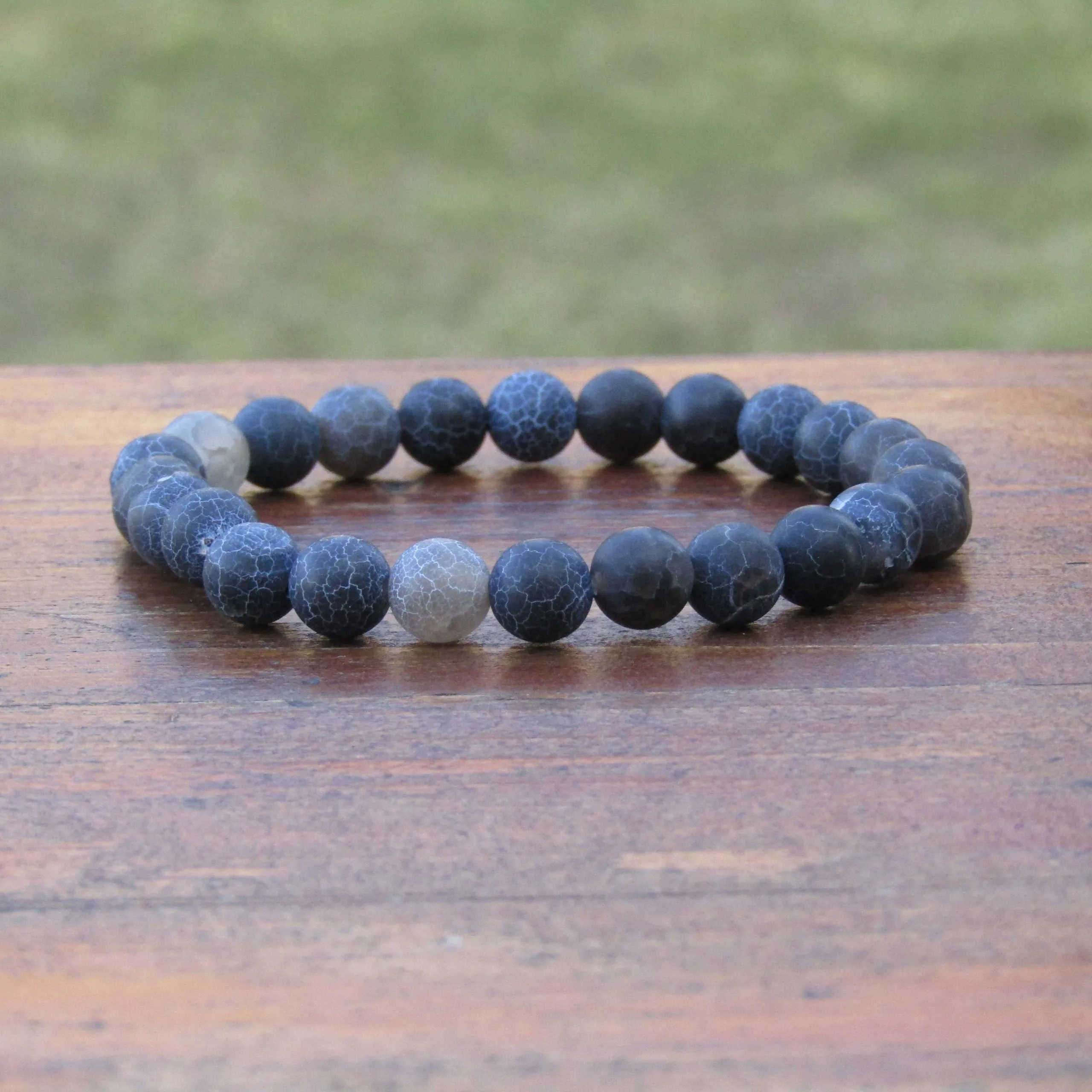 • Repesztett kék-fekete achát: az achát egyik különleges formája a repesztett változat, amelyben az ásvány felületén apró repedések és csillogó részecskék találhatók. A kék és fekete színek harmonikus kombinációja mély és intenzív árnyalatokat ad a karkötőnek. A kék árnyalat a nyugalmat és a harmóniát, míg a fekete szín az erőt és a stabilitást szimbolizálja.