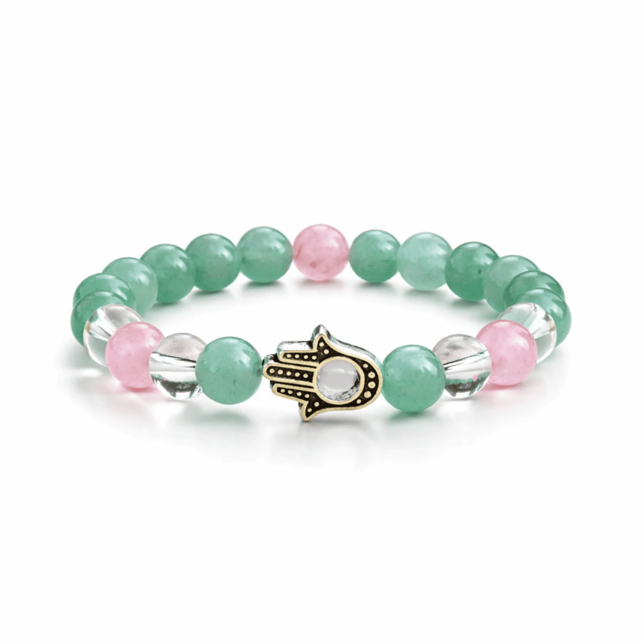 A rózsakvarc fatima keze védelmező ásvány karkötő egy elegáns és jelentéssel bíró ékszer, amely a rózsakvarc, zöld aventurin és hegyikristály ásványok harmonikus kombinációját öleli fel. A karkötő középpontjában egy fatima keze medál található, amelyben egy 4 mm-es zöld rózsakvarc gyöngy van elhelyezve. Ez a karkötő nemcsak esztétikailag vonzó, hanem energetikai és spirituális értéket is képvisel.