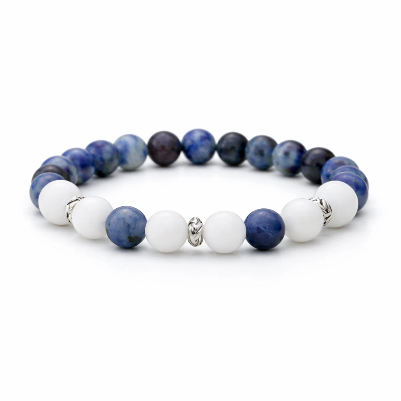 - Szodalit: a szodalit mélykék színe és jellegzetes mintázata erősíti a karkötő esztétikai vonzerejét. Az ásvány elősegíti a mentális tisztaságot és a belső békét.