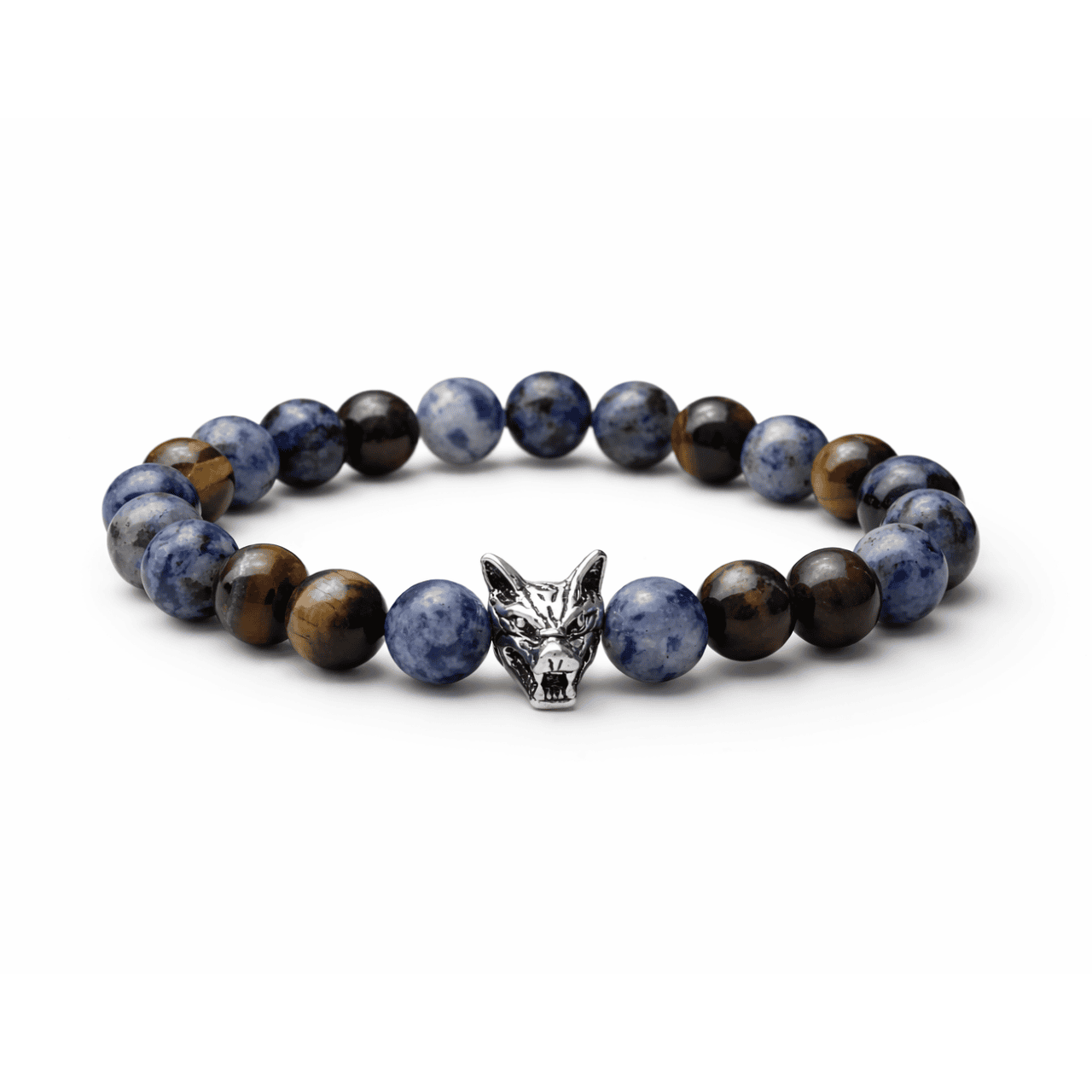 A Wolf szodalit-tigrisszem ásvány karkötő egyedülálló kombinációja a szodalit és a tigrisszem ásványoknak, amely a bátorságot és a belső erőt hangsúlyozza, miközben a farkasfej medál a vadon szellemét és védelmét képviseli.